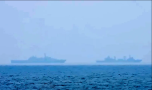 This image taken from a video released by the Taiwan Ministry of National Defense shows what it says are Chinese war ships conducting drills off the coast of western Taiwan on February 26. Taiwan Ministry of National Defense/AP/File